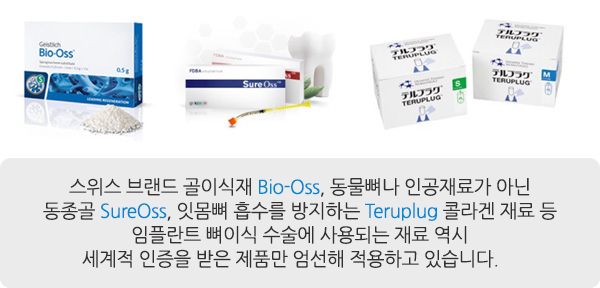 이종골은 인체조직 속에서 뼈를 형성하는 속도가 느려 수술기간이 그만큼 길어질 수 있습니다. 서울샘치과에서는 주로 동종골과 인공뼈재료를 환자 상태에 맞춰 선별 적용하거나 자가골과 혼합합니다. 각 뼈재료는 세계적으로 효과와 안전성을 인증받은 정품들을 엄선해 사용하고 있습니다.