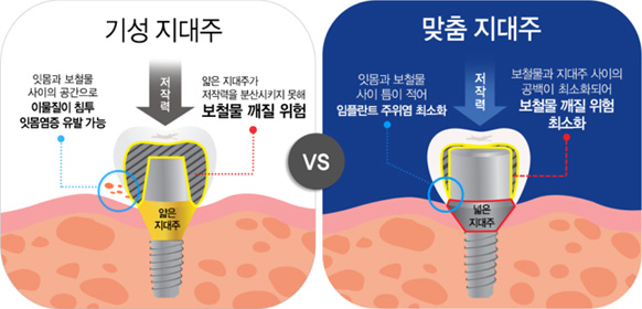 기성 지대주를 이용한 경우 임플란트 주위 염증 발생률이 상대적으로 높고 씹는 힘이 분산되지 못해 치아 모양의 최종보철물이 깨지는 문제가 발생할 수 있기 때문에 서울샘치과는 애초에 임플란트 수술시부터 환자의 구강상태에 맞춘 지대주를 이용해 임플란트수술을 진행하고 재수술시에도 맞춤 지대주를 이용해 이러한 문제 발생을 예방하고자 합니다.