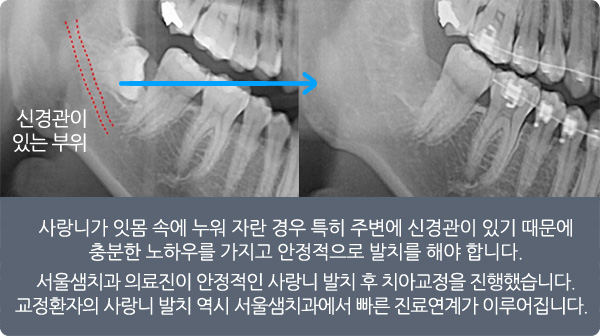 그래서 사랑니를 대부분 발치하게 되는데 사랑니 위치나 형태가 기형적이다 보니 일반 치아 발치와 달리 주의의 치아나 잇몸조직 등을 건드리지 않으면서 안전하게 발치하는 노하우가 중요합니다.